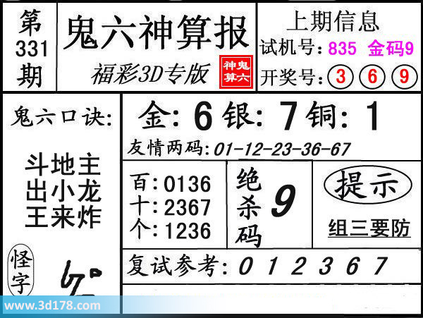 3d第15331期鬼六神算报为您推荐鬼六口诀:3d之家3d鬼六神算报第331期分析如下:鬼六口诀:斗地主,出小龙,王来炸友情两码:01-12-23-36-67复式参考:012367三码推荐金胆:6,银胆:7,铜胆:1定位复式:百位:0136十位:2367个位:1236该鬼六图库由3D之家3D图库频道原创,仅供彩民参考,温馨提供。
