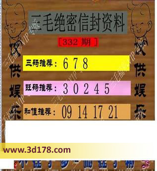 3d之家第2015332期三毛绝密信封资料图:福彩3d第332期三毛绝密信封资料图详解:三码推荐:678旺码推荐:30245和值推荐:09 14 17 21三毛图库由3D之家3D图库频道原创,仅供彩民参考,温馨提供。