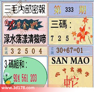 3d之家三毛图库第333期三毛内部密报图详解: 黄金策略:渌水荡漾清猿啼三码:725旺码:325043码组合:924 561 203玄机:30+67=01必中玄机字:蛇
