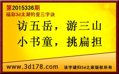 第15336太湖字谜解太湖钓叟三字诀:3d第2015336期太湖图库解字谜:访五岳:访阅五岳,解5有8;游三山:游走三山,解3防9;小书童:小小书童,解0有3;挑扁担:横挑扁担,解1有8。五码复式:01358(防组三)精选10注:019 039 058 138 159 188 189 359 389 5893d太湖图库由3D之家3D图库频道原创,仅供彩民参考,温馨提供。