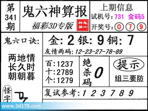 3d第15341期鬼六神算报为您推荐鬼六口诀:3d之家3d鬼六神算报第341期分析如下:鬼六口诀:两地情,长久时,朝朝暮友情两码:12-23-27-78-89复式参考:123789三码推荐金胆:2,银胆:9,铜胆:7定位复式:百位:1237十位:2789个位:1279该鬼六图库由3D之家3D图库频道原创,仅供彩民参考,温馨提供。