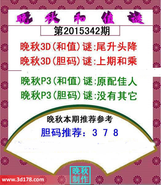 3d之家3d红五晚秋图第2015342期为您推荐分析:晚秋3D(和值)谜:尾升头降晚秋3D(胆码)谜:上期和乘晚秋3D(和值)谜:原配佳人晚秋3D(胆码)谜:没有其他