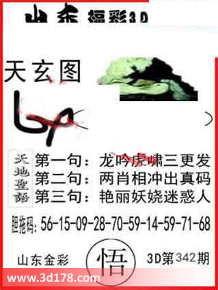 福彩3D第2015342期山东天玄图之天地聖语:3d第15342期山东天玄图分析详情:天地圣语:第一句:龙吟虎啸三更发第二句:两肖相冲出真码第三句:艳丽妖娆迷惑人胆拖码:56-15-09-28-70-59-14-59-71-68该丹东图库由3D之家3D图库频道原创,仅供彩民参考,温馨提供。