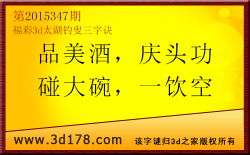 第15347太湖字谜解太湖钓叟三字诀:福彩3d第2015347期太湖图库解字谜详解:品美酒:品尝美酒,解9有3;庆头功:原来是庆功宴,有1防6;碰大碗:大碗装酒干杯,解0防3;一饮空:都要一饮而空,有1解0;五码复式:01369(防组三)精选10注:013 136 169 369 069 039 016 458 268 3673d太湖图库由3D之家3D图库频道原创,仅供彩民参考,温馨提供。