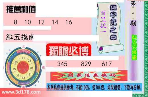 3d之家红五图库第15347期福彩3d红五图为您推荐:3d第2015347期红五玄机图详细内容:推荐和值:8 10 12 14 16独胆必博:345 829 617 四字记之曰:百里挑一该红五图库由福彩3D之家3D图库频道原创,仅供彩民参考,温馨提供。