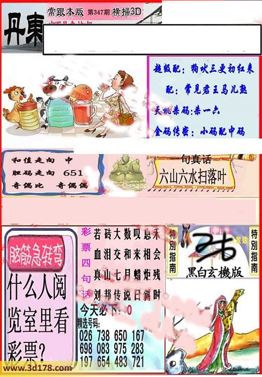 福彩3d丹东图库综合推荐一句真话:3d之家第2015347期丹东快报图详解:超级配:狗吠三更初红来配:常见君王马儿熬天机杀码:杀一六和值走向:中胆码走向:651奇偶比:奇偶偶金码传密:小码配中码精选号码:026 738 650 167 968 083 975 283 197 654 483 721脑筋急转弯:什么人阅览室看彩票?该丹东图库由3D之家3D图库频道原创,仅供彩民参考,温馨提供。