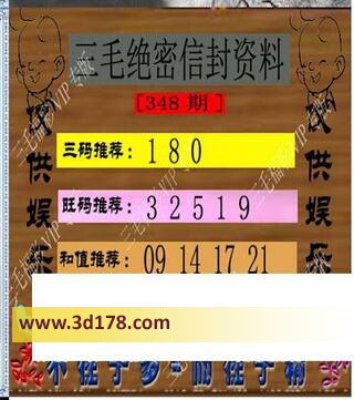 3d之家第2015348期三毛绝密信封资料图:福彩3d第348期三毛绝密信封资料图详解:三码推荐:180旺码推荐:32519和值推荐:09 14 17 21三毛图库由3D之家3D图库频道原创,仅供彩民参考,温馨提供。