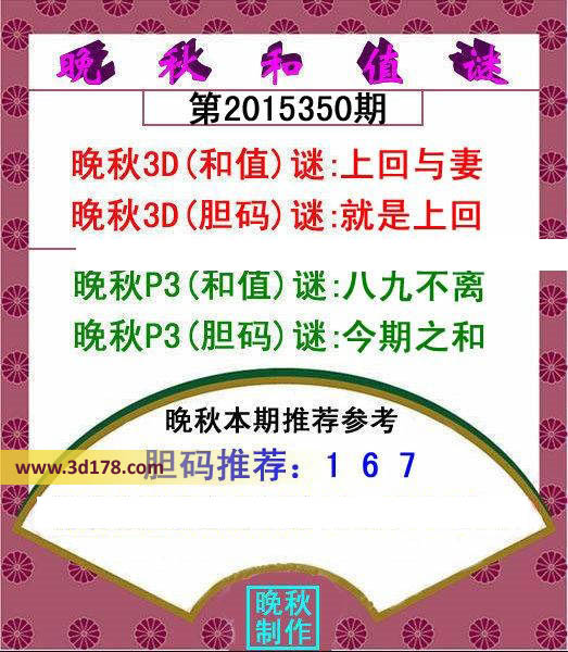 晚秋3D(和值)谜:上回与妻