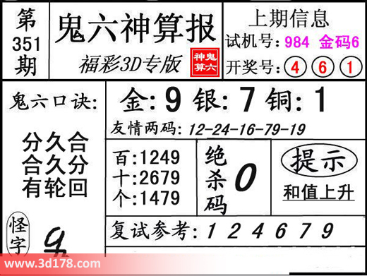 3d第15351期鬼六神算报为您推荐鬼六口诀:3d之家3d鬼六神算报第351期分析如下:鬼六口诀:分久合,合久分,有轮回复式参考:124679三码推荐金胆:9,银胆:7,铜胆:1定位复式:百位:1249十位:2679个位:1479该鬼六图库由3D之家3D图库频道原创,仅供彩民参考,温馨提供。