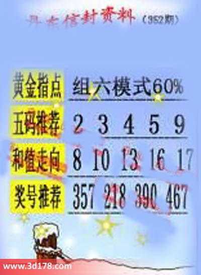 第2015352期丹东信封资料推荐:黄金指点:组六模式60% 五码推荐:23459和值走向:8 10 13 16 17奖号推荐:357 218 390 467该丹东图库由3D之家3D图库频道原创,仅供彩民参考,温馨提供