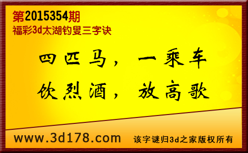 第15354太湖字谜解太湖钓叟三字诀:福彩3d第2015354期太湖图库解字谜详解:四匹马:这里有四匹马,解4有3;一乘车:原来是马车,有1防7;饮烈酒:喝烈酒,解9防6;放高歌:放声高歌了,有0解8。六码复式:013489(防组三)精选10注:014 147 148 789 089 368 689 678 009 8893d太湖图库由3D之家3D图库频道原创,仅供彩民参考,温馨提供。