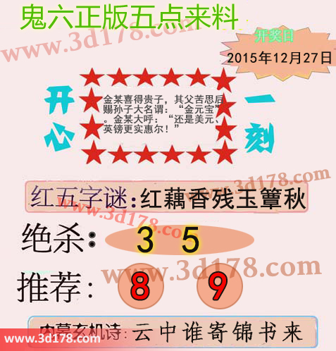 福彩3d鬼六图库第15354期鬼六正版五点来料图:第354期3d鬼六五点来料图详解:字谜:红藕香残玉簟秋绝杀:3 5两胆码推荐:8 9内幕玄机诗:云中谁寄锦书来该鬼六图库由福彩3D之家3D图库频道原创,仅供彩民参考,温馨提供。