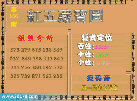 红五藏宝图第15356期3d推荐:3d之家3d红五藏宝图第2015356期为您推荐复式定位、捉码诗以及组号分析:复式定位:百位:32867十位:13579个位:61358捉码诗:四一呈祥今降临组号分析:375 279 675 158 389057 649 596 325 645385 756 360 197 537375 739 871 563 938红五图库由3D之家3D图库频道原创,仅供彩民参考,温馨提供。