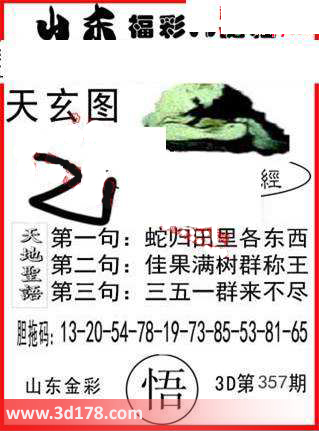 福彩3D第2015357期山东天玄图之天地聖语:3d第15357期山东天玄图分析详情:天地圣语:第一句:蛇归田里各东西第二句:佳果满树群称王第三句:三五一群来不尽胆拖码:13-20-54-78-19-73-85-53-81-65该丹东图库由3D之家3D图库频道原创,仅供彩民参考,温馨提供。
