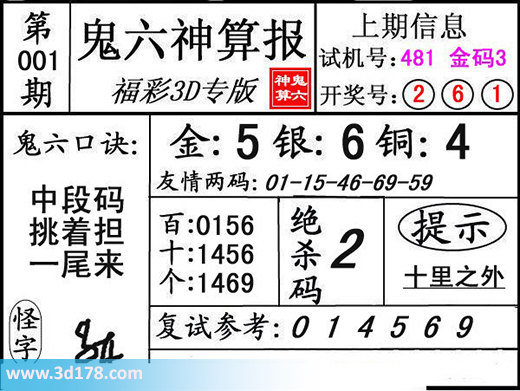 3d第16001期鬼六神算报为您推荐鬼六口诀:3d之家3d鬼六神算报第001期分析如下:鬼六口诀:中段码,挑着担,一尾来。复式参考:014569三码推荐金胆:5,银胆:6,铜胆:4定位复式:百位:0156十位:1456个位:1469该鬼六图库由3D之家3D图库频道原创,仅供彩民参考,温馨提供。