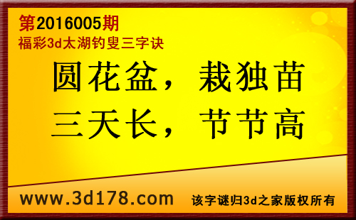 第16005太湖字谜解太湖钓叟三字诀:福彩3d第2016005期太湖图库解字谜详解:圆花盆:圆花盆栽花,解0有9;栽独苗:只栽一棵独苗,解1防8;三天长:三天就长大了,解3防9;节节高:一天天节节高,解1有5。六码复式:013589(防组三)精选10注:032 168 041 234 864 134 601 231 871 5413d太湖图库由3D之家3D图库频道原创,仅供彩民参考,温馨提供。