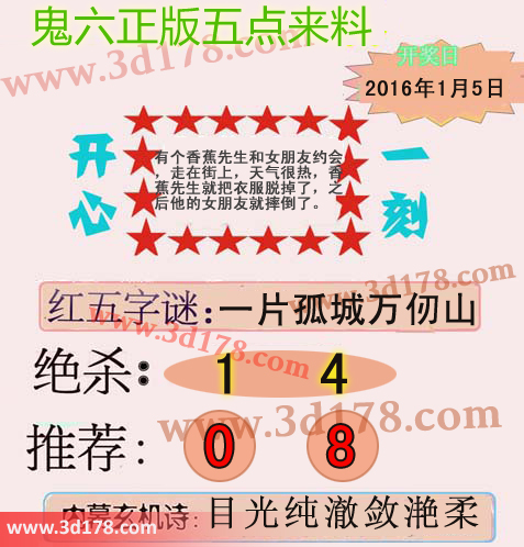 福彩3d鬼六图库第16005期鬼六正版五点来料图:第005期3d鬼六五点来料图详解:字谜:一片孤城万仞山绝杀:1 4两胆码推荐:2 7内幕玄机诗:目光纯澈敛滟柔该鬼六图库由福彩3D之家3D图库频道原创,仅供彩民参考,温馨提供。