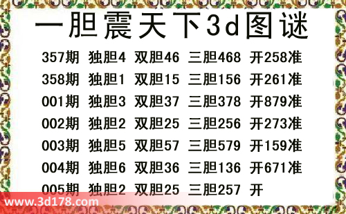 一胆震天下三胆图库由3D之家3D图库频道原创,仅供彩民参考,温馨提供。