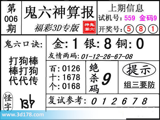 3d第16006期鬼六神算报为您推荐鬼六口诀:3d之家3d鬼六神算报第006期分析如下:鬼六口诀:打狗棒,帮打狗,代代传。复式参考:012678三码推荐金胆:1,银胆:8,铜胆:0定位复式:百位:0126十位:1678个位:0168该鬼六图库由3D之家3D图库频道原创,仅供彩民参考,温馨提供。