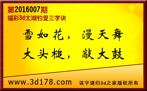 第16007太湖字谜解太湖钓叟三字诀:福彩3d第2016007期太湖图库解字谜详解:雪如花:冬天的雪像花,解6有5;漫天舞:漫天飞舞,防1解5;大头槌:大头槌棒,解1防3;敲大鼓:用来敲大鼓,有0解9。六码复式:013569(防组三)精选10注:013 135 156 159 569 039 339 559 556 5673d太湖图库由3D之家3D图库频道原创,仅供彩民参考,温馨提供。