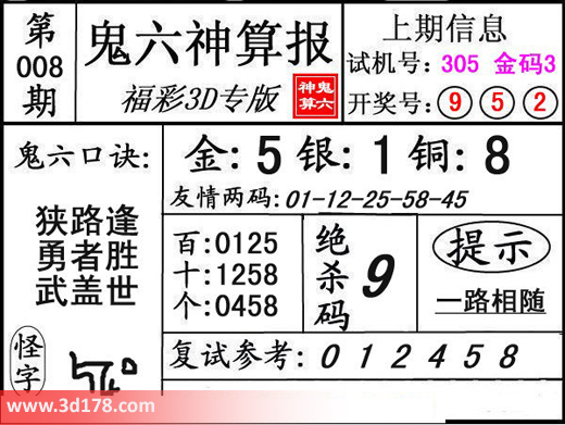 3d第16008期鬼六神算报为您推荐鬼六口诀:3d之家3d鬼六神算报第008期分析如下:鬼六口诀:狭路逢,勇者胜,武盖世。复式参考:012458三码推荐金胆:5,银胆:1,铜胆:8定位复式:百位:0125十位:1258个位:0458该鬼六图库由3D之家3D图库频道原创,仅供彩民参考,温馨提供。