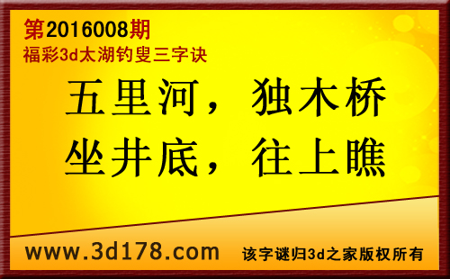 第16008太湖字谜解太湖钓叟三字诀:福彩3d第2016008期太湖图库解字谜详解:五里河:五里长的河流,解5有8;独木桥:一座独木桥,解1防7;坐井底:坐在深井底,解4防7;往上瞧:往上瞧看天,解3有5;六码复式:134578(防组三)精选10注:026 059 148 179 267 289 346 359 468 5793d太湖图库由3D之家3D图库频道原创,仅供彩民参考,温馨提供。