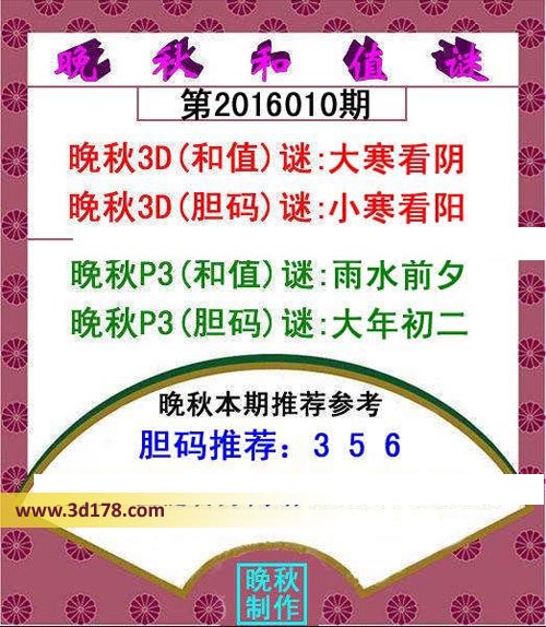 3d之家3d红五晚秋图第2016010期为您推荐分析:晚秋3D(和值)谜:大寒看阴晚秋3D(胆码)谜:小寒看阳晚秋p3(和值)谜:雨水前夕晚秋p3(胆码)谜:大年初二胆码推荐:356红五图库由3D之家3D图库频道原创,仅供彩民参考,温馨提供。