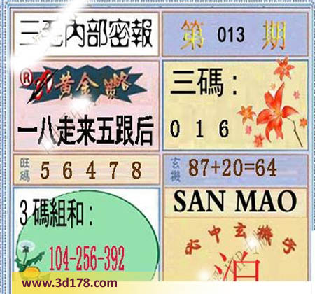 黄金策略:一八走来五跟后三码:016旺码:564783码组合:104 256 392玄机:87+20=64必中玄机字:泊