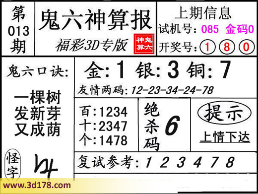 3d第16013期鬼六神算报为您推荐鬼六口诀: