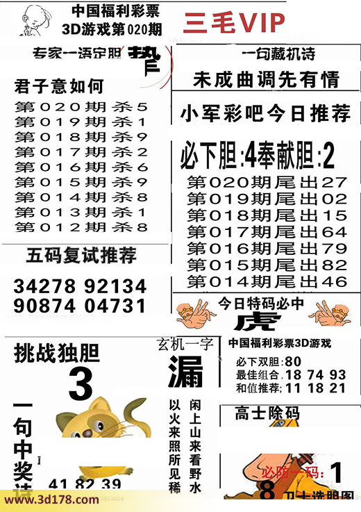 第20116020期3d三毛图库为您解读本期专家一语定胆:3d第2016020期三毛图库VIP详解:一句藏机诗:未成曲调先有情第2016020期杀一码推荐:5必下双胆:80挑战独胆:3五码复式推荐:34278 92134 90874 04731今日特码必中:虎最佳组合:18 74 93和值推荐:1 18 21玄机一字:漏该三毛玄机解码图由福彩3D之家3D图库频道原创,仅供彩民参考,温馨提供。