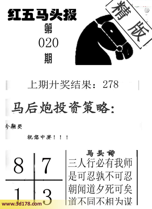 福彩3d第2016020期红五马头报(精版)推荐:3d第16020期红五马头报本期马头诗详解:上期开奖号码:278马头诗:三人行必有我师,是可忍孰不可忍,朝闻道夕死可矣,道不同不相为谋。今期买:8713该红五图库由福彩3D之家3D图库频道原创,仅供彩民参考,温馨提供。