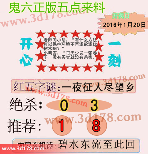 福第16020期3d鬼六五点来料图详解:3d鬼六图库第16020期鬼六正版五点来料图:字谜:一夜征人尽望乡绝杀:0 3两胆码推荐:1 8内幕玄机诗:碧水东流至此回该鬼六图库由3D之家3D图库频道原创,仅供彩民参考,温馨提供。