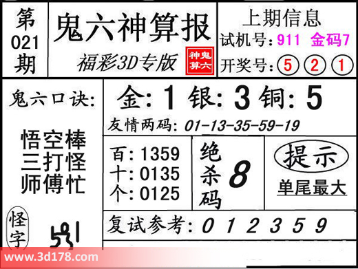 3d第16021期鬼六神算报为您推荐鬼六口诀:3d之家3d鬼六神算报第021期分析如下:鬼六口诀:悟空棒,三打怪,师傅忙。复式参考:012359三码推荐金胆:1,银胆:3,铜胆:5定位复式:百位:1359十位:0135个位:0125绝杀码:8友情两码:01-13-35-59-19该鬼六图库由3D之家3D图库频道原创,仅供彩民参考,温馨提供。