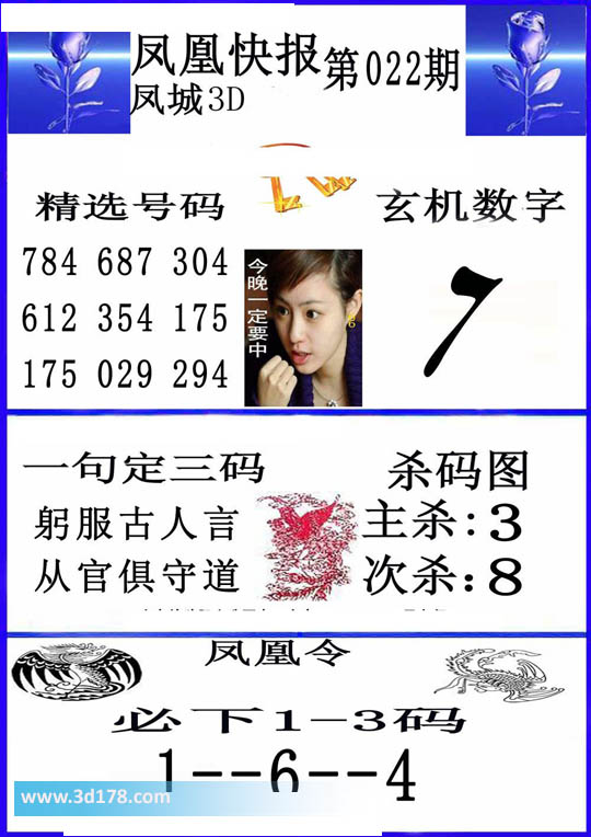 3d第16022期凤凰快报内容解析:玄机数字:7精选号码:784 612 175 687 354 029 304 175 194一句定三码:躬服古人言,从官俱守道杀码图:主杀:3 次杀:8凤凰令:必下 码1-3,1-6-4该凤凰快报图库由3D之家3D图库频道原创,仅供彩民参考,温馨提供。