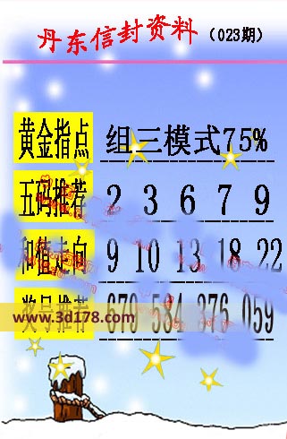 第2016023期丹东信封资料推荐:黄金指点:组三模式75% 五码推荐:23679和值走向:9 10 13 18 22奖号推荐:679 584 376 059该丹东图库由3D之家3D图库频道原创,仅供彩民参考,温馨提供。