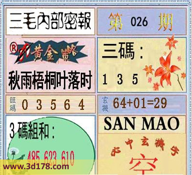 福彩3d第026期三毛内部密报综合推荐如下:3d之家三毛图库第026期三毛内部密报图详解:黄金策略:二八取一九四中三码:135旺码:035643码组合:485 623 610玄机:64+01=29必中玄机字:空该三毛内部密报图库由3d之家3D图库频道原创,仅供彩民参考,温馨提醒。