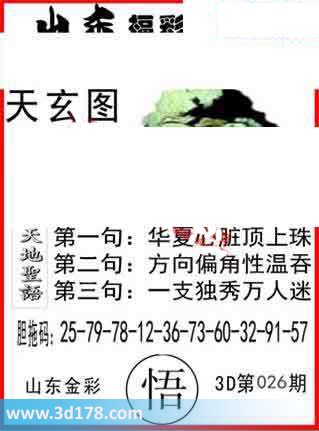 福彩3D第2016026期山东天玄图之天地聖语:3d第16026期山东天玄图分析详情:天地圣语:第一句:华夏心脏顶上珠第二句:方向偏角性温吞第三句:一枝独秀万人迷胆拖码:25-79-78-12-36-73-60-32-91-57该丹东图库由3D之家3D图库频道原创,仅供彩民参考,温馨提供。