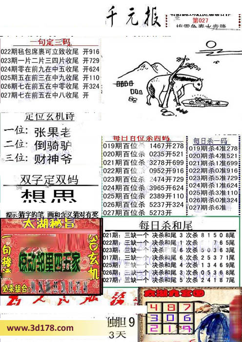 福彩3d第2016027期布衣千元报图详情分析如下:定位玄机诗一位:张果老二位:倒骑驴三位:财神爷每日百位杀四码:5273每日杀一码:6每日杀和尾:1三缺一个决杀和尾5次杀24187尾 布衣图库由福彩3D之家3D图库频道原创,仅供彩民参考,温馨提供。