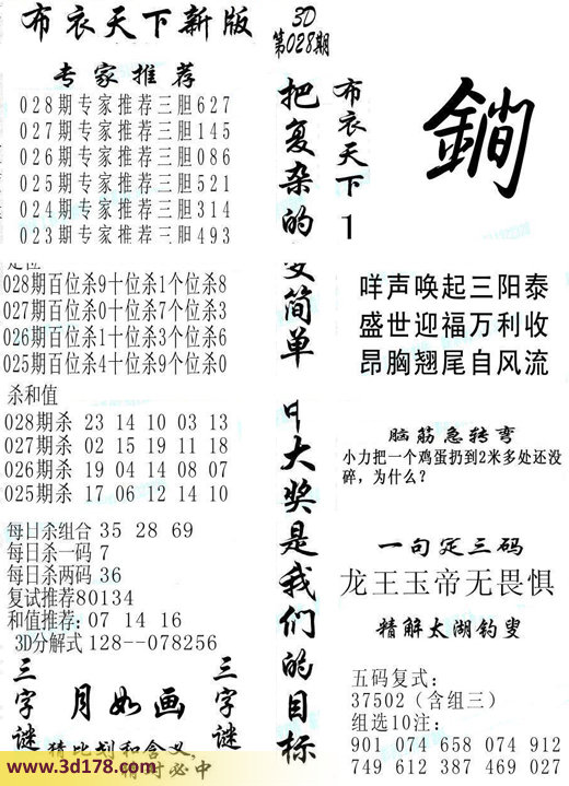 2016028期福彩3d布衣天下新版:本期3d之家布衣图库3d布衣天下新版详解:定位杀号推荐:百位杀9 十位杀1 个位杀8杀和值推荐:23 14 10 03 13每日杀组合:35 28 69每日杀一码:7每日杀两码:36复式推荐:80134和值推荐:07 14 163d分解式:128-0782563d布衣图库玄机诗:咩声唤起三阳台,盛世迎福万利收,昂胸翘尾自风流。该布衣图库由福彩3D之家3D图库频道原创,仅供彩民参考,温馨提供。