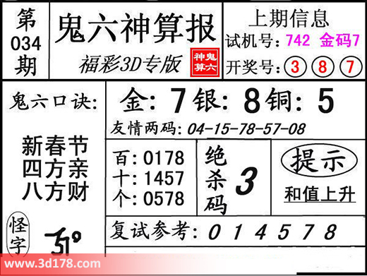 3d第16034期鬼六神算报为您推荐鬼六口诀: