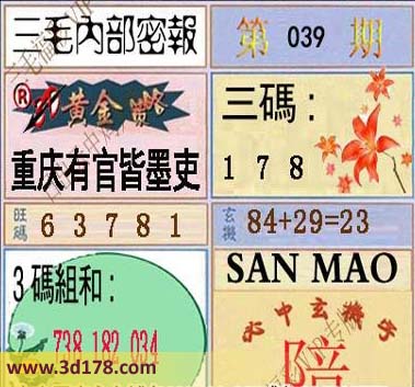 3d之家三毛图库第039期三毛内部密报图详解:黄金策略:重庆有官皆墨吏三码:178旺码:637813码组合:738 182 034玄机:84+29=23必中玄机字:陪该三毛内部密报图库由3d之家3D图库频道原创,仅供彩民参考,温馨提醒。