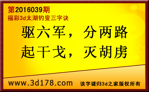 第16039太湖字谜解太湖钓叟三字诀:福彩3d第2016039期太湖图库解字谜详解:驱六军:驱散六军,解6防7;分两路:士兵分两路行进,解2防4;起干戈:两军起了干戈,解7防2;灭胡虏:而我军灭了胡虏,解5有1;五码复式:12457(防组三)精选10注:192 057 928 740 827 341 574 023 716 2073d太湖图库由3d之家3D图库频道原创,仅供彩民参考,温馨提供。