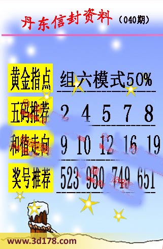 第2016040期丹东信封资料推荐:黄金指点:组六模式50%五码推荐:24578和值走向:9 10 12 16 19奖号推荐:523 950 749 651 该丹东图库由3D之家3D图库频道原创,仅供彩民参考,温馨提供。