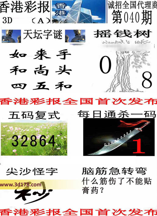 本期3d香港彩报图详情如下:天坛字谜:如来手,和尚头,四五和。摇钱树:0 8五码复式:32864每日通杀一码:1脑筋急转筋:什么筋伤了不能?该香港彩报由3D之家3D图库频道原创,仅供彩民参考,温馨提供。