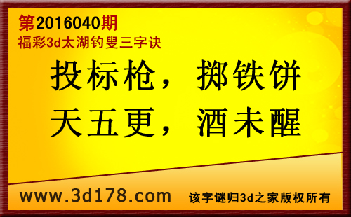 第16040太湖字谜解太湖钓叟三字诀:福彩3d第2016040期太湖图库解字谜详解:投标枪:投掷标枪,解1防7;掷铁饼:掷铁饼比赛,解0防4;天五更:早上天没亮五更的时候,解5有4;酒未醒:酒还没醒透,解9有5。五码复式:04579(防组三)精选10注:710 293 748 104 157 897 034 619 823 2083d太湖图库由3d之家3D图库频道原创,仅供彩民参考,温馨提供。