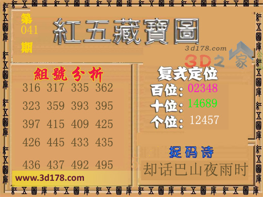 3d之家3d红五藏宝图第206041期为您推荐复式定位、捉码诗以及组号分析: