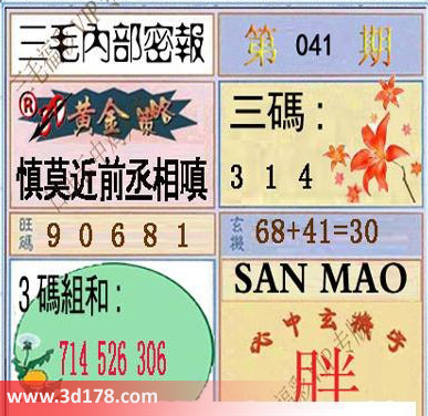3d之家三毛图库第041期三毛内部密报图详解:黄金策略:慎莫近前丞相嗔三码:314旺码:906813码组合:714 526 306玄机:68+41=30必中玄机字:胖