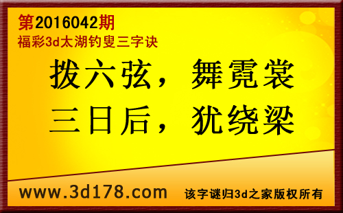 第16042太湖字谜解太湖钓叟三字诀:拨六弦:拨弄六弦琴,解6防8;舞霓裳:舞动裙子的下摆,解5有6;三日后:三日之后,解3有4;犹绕梁:琴声还能绕梁,解0防9;五码复式:04568(防组三)精选10注:045 056 089 456 459 468 568 569 589 6893d太湖图库由3d之家3D图库频道原创,仅供彩民参考,温馨提供。
