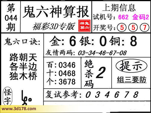 3d第16044期鬼六神算报为您推荐鬼六口诀:
