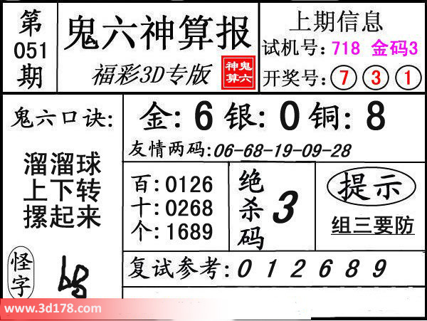 3d第16051期鬼六神算报为您推荐鬼六口诀: